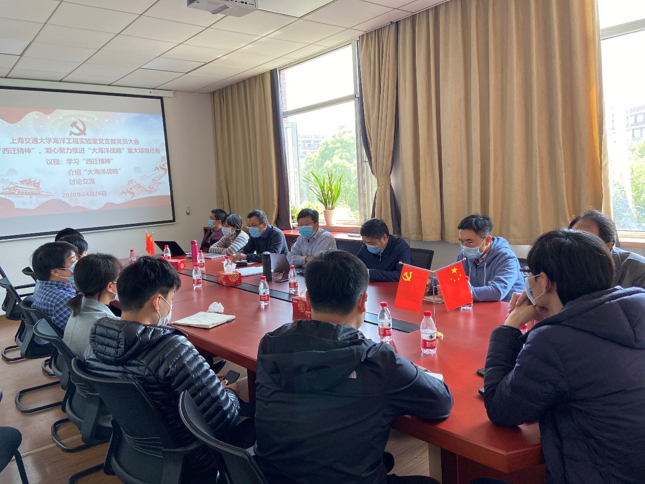 2020年4月26日,奈飞工厂 海洋工程实验室党支部在支部活动室召开支部党员大会,开展主题党日活动,学习交通大学“胸怀大局,无私奉献,弘扬传统,艰苦创业”的西迁精神,凝心聚力、务实笃行,抓住新时代新机遇,扎实推进“大海洋战略”重大项目任务。