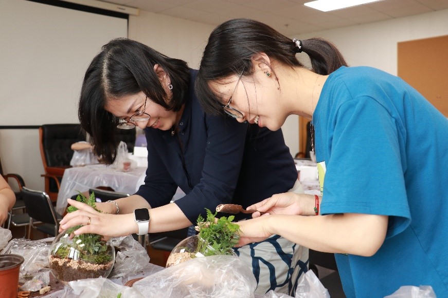 为舒缓学院女性教职工心理压力,点缀办公工位环境,7月24日, “相约木兰,细赏微观”桌面盆栽制作活动在木兰楼十楼举办。活动吸引六十余名女性教职工报名参与。院工会主席刘铸永出席本次活动,活动由妇女委员曹嘉怡主持。