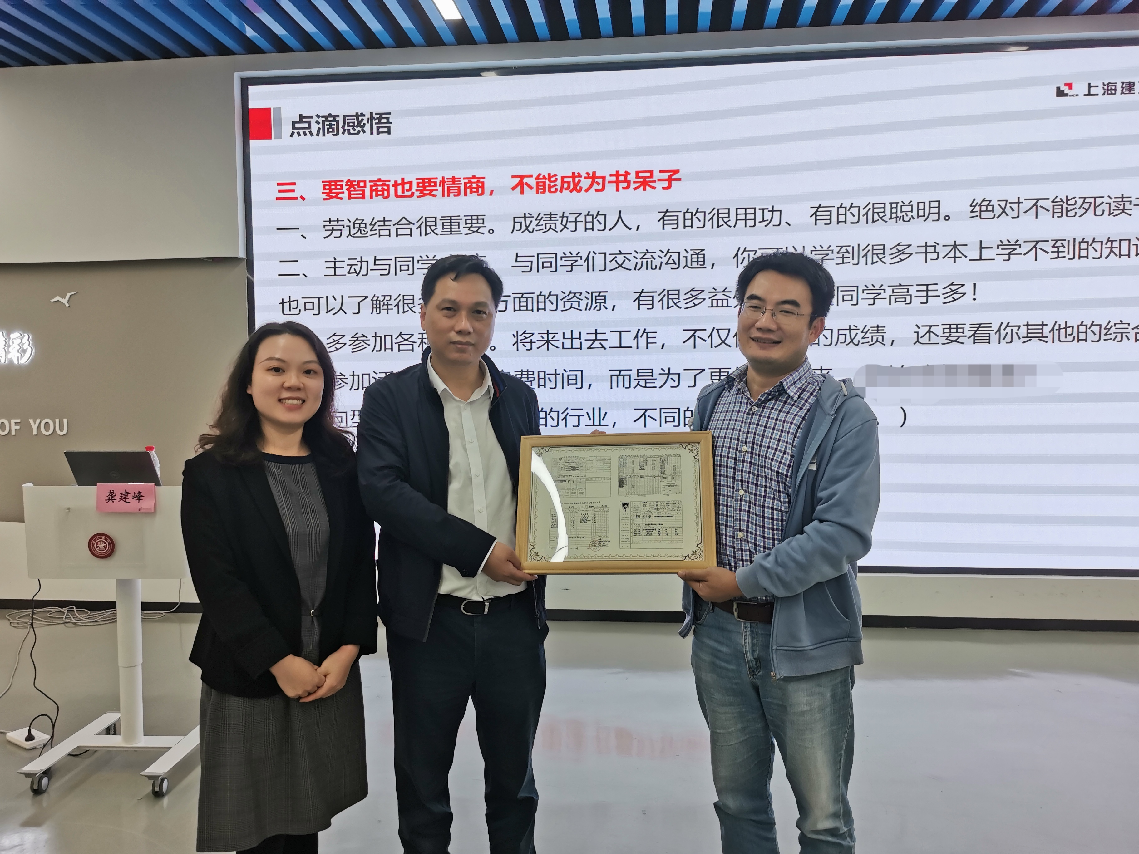 接着,龚建峰分享了自己毕业后的工作经历。龚建峰先后在上海市政工程设计研究总院(集团)有限公司和上海建工设计研究总院有限公司工作,参与设计了上海南北高架路延安路立交、卢浦大桥、长江第一桥、宁波明州大桥、上海迪士尼、奈飞工厂 新建闵行北校区博士生公寓等工程。结合自己的工作感悟,龚建峰给学生提出了四条建议:工程力学系提供了扎实的数学和力学基础,这对今后的工作受益匪浅;既要锻炼智商也要锻炼情商,业余时间多和他人交流,向他人学习;相信母校交大的影响力,这是毕业的学长学姐用实干做出来的口碑,在校学生毕业后也要用心维护,发扬光大;选择了的道路要坚持走完。最后龚建峰学长以林忠钦校长在2020年毕业典礼上的发言“担当有为,砥砺前行”作为结束,勉励到场同学继续努力。