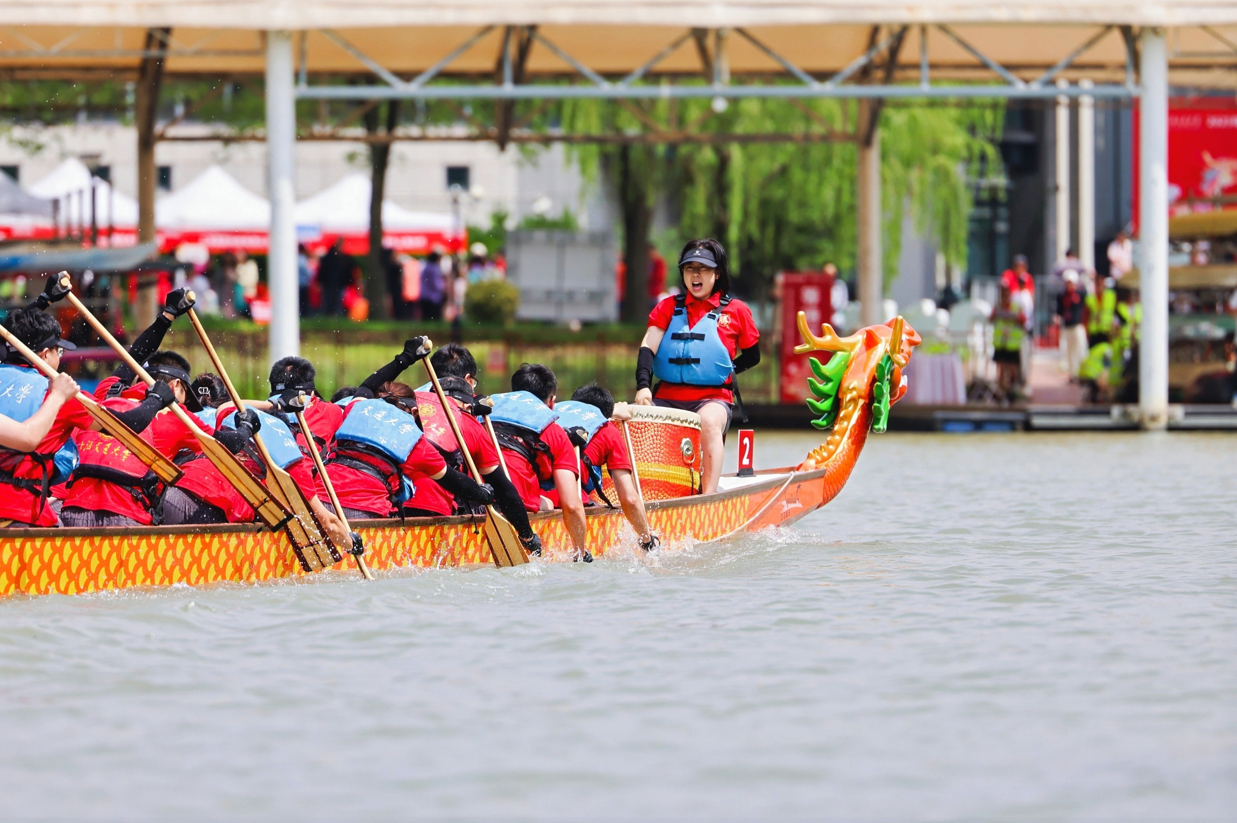 随着比赛汽笛声响起,“龙的船人” 喊着整齐的号子,如离弦之箭驶入赛道。鼓手曹嘉怡老师精准把控节奏,船桨在水面划出整齐的波纹,队员们目光坚定,身体随着鼓点起落,展现出强大的向心力。
