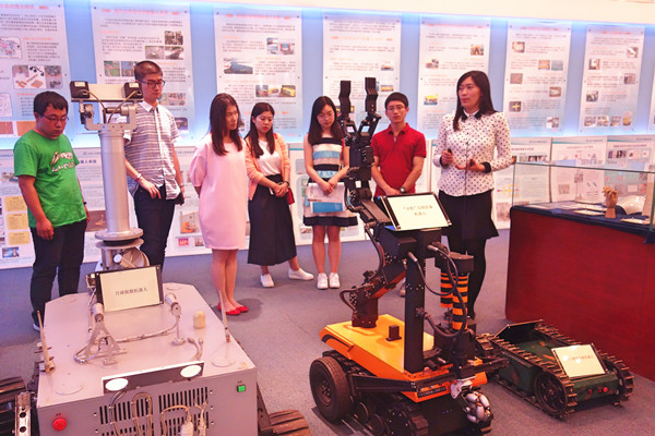 当天下午,师生们来到中国科学院沈阳自动化研究所(以下简称自动化所)。同学们首先参观了所内陈列室,深入了解了自动化所的历史沿革、研究领域和研究成果。随后,水下机器人研究室田老师、海洋信息技术装备中心周老师分别对所属部门的研究方向和人才需求进行了深入讲解,同学们还跟随田老师参观了研究室的试验设备和成果模型,并就部分专业问题进行了交流。98届校友何振、07届校友郎智明也与同学们分享了自己的就业选择,并勉励同学们扎实基础知识的学习,坚定选择适合自己的工作领域。