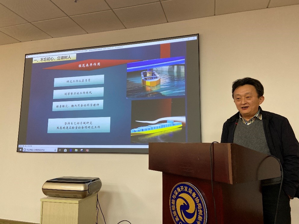 接着三位研究生导师代表分享了自己多年来培养研究生的心路历程和心得体会。船舶与海洋工程系导师代表马宁老师首先分享了自己培养研究生的几点心得。马老师提到,导师要践行“不忘初心、立德树人”,首先要起到模范表率作用;重视营造实验室良好的学术氛围、指导学生养成严谨务实的工作学习习惯;需理论结合实践、培育工程领军人才需具备的知识涵养和能力;全力支持培养学生的国际视野。导师还需对学生关心呵护,亦师亦友。从学术研究上要严格要求,并且注重计划性;培育实验室的大家庭意识,重视氛围建设。培养学生的责任担当之心,发现问题及时与各方通力解决。导师还应因材施教、促进每位学生的成长成才。对 “逸才”的优秀学生给予更大的学术发展空间,对基础一般的学生发挥其特长,增强其信心并树立目标。教育学生树立远大理想,成为国之栋梁、学术之星。