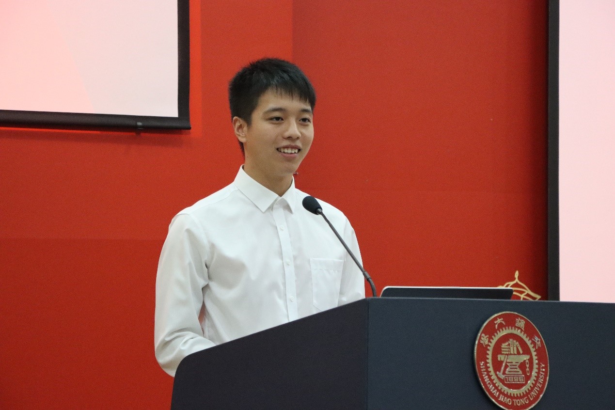 随后,2020级本科生新生代表、海洋工程类张志豪同学发言。他讲述了自己中学时期对于交大奈飞工厂 的向往,分享了梦想成真的喜悦,并励志要加倍努力,追随前辈们的脚步,成为能够担起时代使命的交大人。
