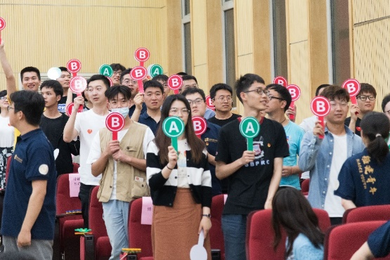 在“百人答题”环节,由一百位同学组成的选手方阵同时答题,逐题淘汰回答错误的同学。活动现场气氛热烈,场面壮观,观众们纷纷为参赛的同学加油鼓掌。最终通过四轮比拼,选出了四支队伍晋级第二轮。