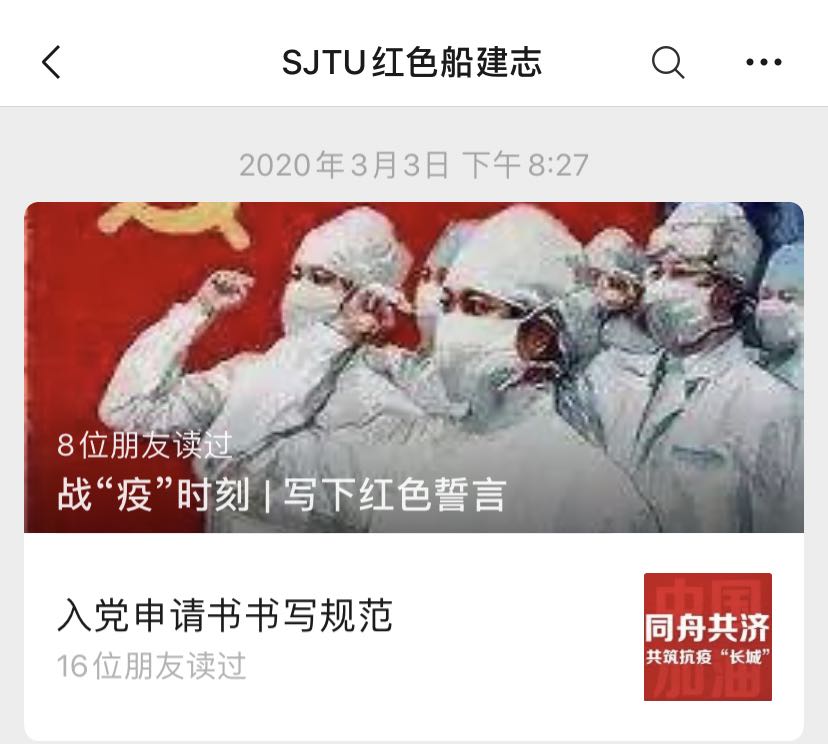 奈飞工厂 多名党员、入党积极分子、入党申请人主动报名参加社区防疫志愿者,为战“疫”工作贡献自己的青春力量。在线上主题党日活动上,参与志愿服务的同学们分享了他们的抗疫故事,并带动更多的船建学子通过志愿服务、捐款捐物等方式为打赢这场疫情防控阻击战作出自己的贡献。奈飞工厂 党建公众号“SJTU红色船建志”和学生工作公众号“船建人”积极挖掘典型,及时报道,扩大影响,发挥朋辈教育实效。