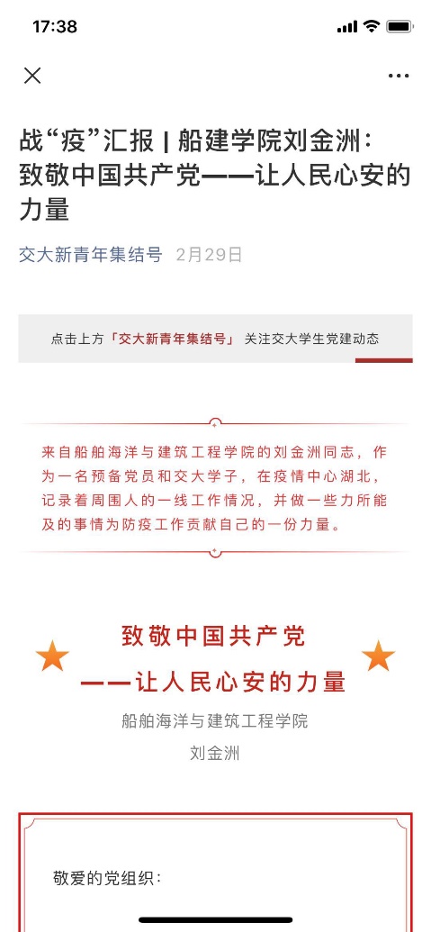 战“疫”时刻,动员学子写下红色誓言。特殊时期,众多党员主动请缨一线、不计生死的感人事迹,让同学们深刻感受到党员队伍的先进性和纯洁性,激发了新时代大学生的使命感和向党组织积极靠拢的意愿。学院党建公众号在这特殊时期,通过“写下红色誓言”的推送,鼓励青年学子积极向党组织靠拢,团结和凝聚在党的旗帜下。目前,学院共收到近50份入党申请书,较以往同期有大幅度增加。各学生党支部通过线上平台及时进行谈话和考察,并电子记录谈话内容。