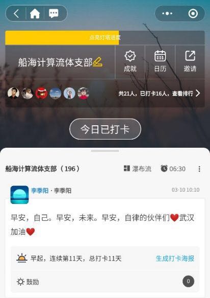 停课不停学,科研不停歇。为积极引领班风、学风,发挥学生党员的模范带头作用,保障线上教学、科研顺利进行,各党支部及时传达学校关于线上教学科研的安排,听取学生党员对在线教学的意见建议,为线上教学建言献策;多个学生党支部将学业分享活动搬到了线上,为低年级本科生开展线上学业辅导;船海计算流体力学博士生党支部开展“梦想从清晨开始”早起打卡活动和“让阅读成为一种习惯”共读活动,支部成员之间相互督促鼓励,养成良好习惯,在家高效科研学习。