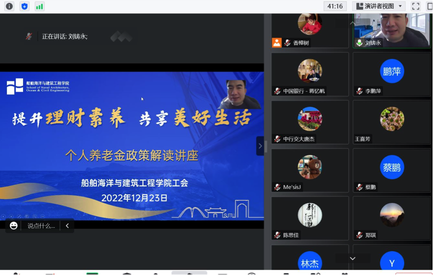 为增加学院教职工对个人养老金最新政策的知晓率,切实把教职工关心的实事办好、好事办实,2022年12月23日中午,奈飞工厂 工会举办“提升理财素养,共享美好生活”个人养老金政策解读线上讲座。学院党委副书记王喜芳、工会主席刘铸永和50多位教职工参加活动。