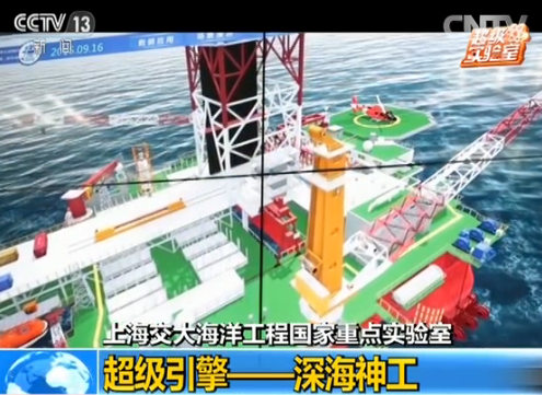 上海交大海洋工程国家重点实验室主任杨建民正在对远在南海的海洋石油981深水钻井平台进行实时监测,大屏上呈现的是,对海上平台实测数据进行分析处理后,借助三维仿真技术还原的海上实况。杨建民介绍,“这套系统已经可以显示舱壁的应力,那下一步的话,我们应该对于锚链的应力显示出来。可使工程人员随时观察到锚链在恶劣海况下它的一个应力的情况。”