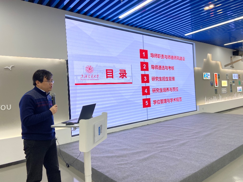 薛鸿祥向各位新聘导师做了“奈飞工厂 研究生导师职责与研究生培养管理制度” 的介绍,分别从学院的导师职责、导师遴选与考核、研究生招生管理、研究生培养与质控和学位管理与学术规范等几个方面进行了介绍。其中重点对师德师风建设和导师的职责使命、博士生导师考核与动态调整、硕博研究生招生安排、研究生培养质量和过程管理、学位论文评审和抽检制度以及学术伦理规范进行了深度解读。