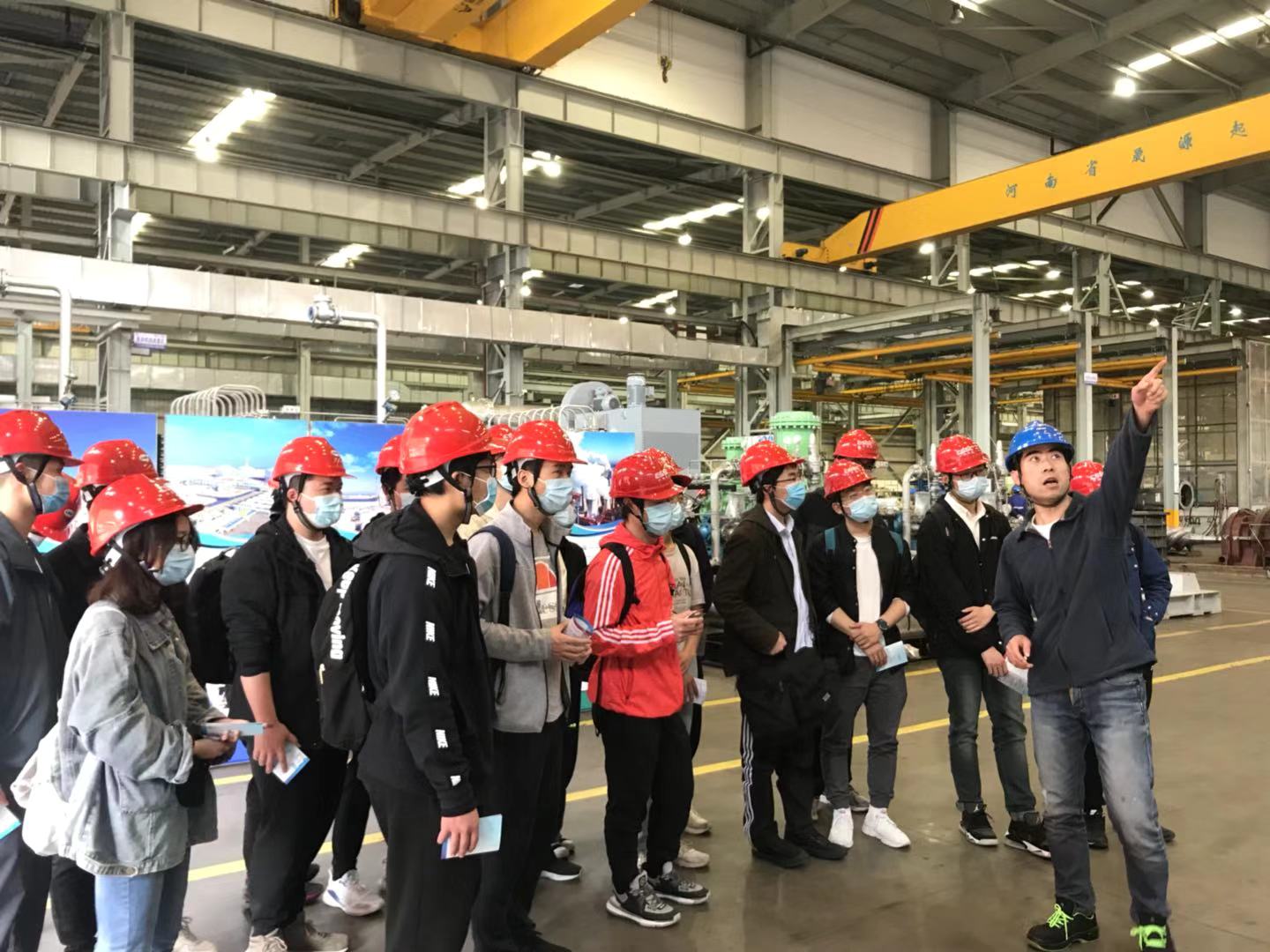 随后,压缩机事业部车间负责人高培文带领同学们参观了螺杆压缩机的生产车间。螺杆压缩机在石油化工、煤化工和油田等能源装备领域,以及热泵和膨胀机的节能环保领域有重要作用。整个车间,从3区的压缩机配件生产,2区的螺杆加工设备与步骤,到1区的整机生产,各环节环环相扣,紧密联系。通过高培文负责人的详细讲解,随行师生切实了解到了一些在实际生产中需要注意的问题,明白了理论和实践有一定差距。