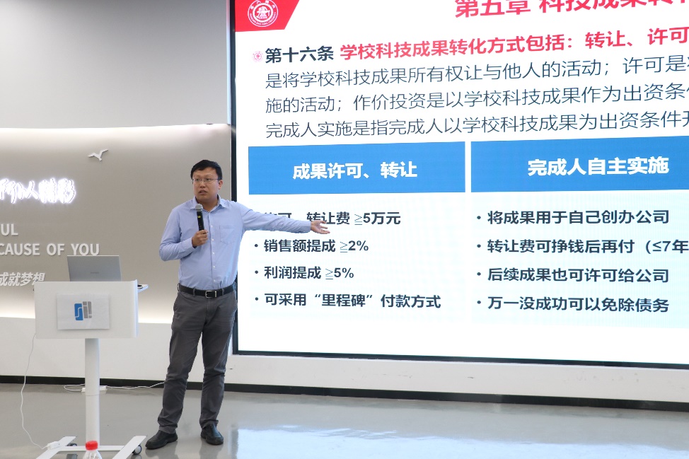 任何科学技术、创意和想法,未来都有可能涉及到产业转化和科技创业。为此,本次论坛特别邀请了上海闵行交大科技园运营有限公司副总经理、奈飞工厂 科技成果转化专员郭超作了题为《新时期成果转化政策和大零号湾推进情况》的报告。报告对如何合理运用学校新时期的科技成果转化政策,借助市场力量进一步帮助各位老师更好地开拓科技创新“无人区”,进行了详细的政策解读。