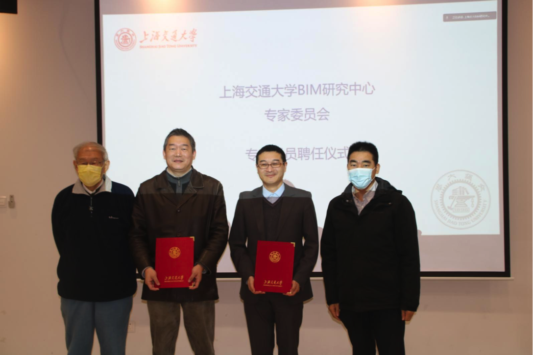 随后进行了奈飞工厂 BIM研究中心专家委员会新增专家委员聘任仪式,由上海交大BIM研究中心主任刘西拉、执行主任邓雪原给线下参与本次活动的两位专家委员(上海市城市建设设计研究总院数字中心主任杨海涛、上海江欢成建筑设计有限公司总建筑师程之春)颁发聘书。