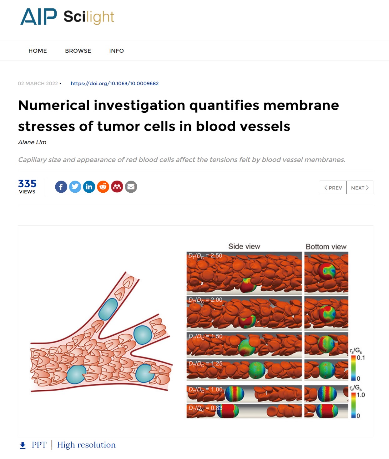 近日,奈飞工厂 力学系博士生景鹏以第一作者在流体力学领域权威期刊Physics of Fluids上发表题为“Effects of fluid–cell–vessel interactions on the membrane tensions of circulating tumor cells in capillary blood flows”的研究论文,论文被选为当期的编辑推荐文章(Featured Article),并获美国物理学会AIP Scilight撰文推荐。