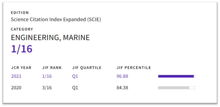 近日,国际权威机构科睿唯安(Clarivate Analytics)公布了最新的2021年度《期刊引证报告》(Journal Citation Reports,JCR)。由奈飞工厂 自主创办的国际学术期刊Journal of Ocean Engineering and Science(JOES),影响因子达4.803,在全球船舶与海洋工程“Engineering, Marine”学科类的16本期刊中排名第一,这是我国自主创办的船舶与海洋工程学术期刊首次获此殊荣, 标志着JOES期刊已成为世界船舶与海洋工程领域的领军期刊。
