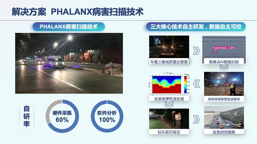 筑升团队的道路空洞检测解决方案命名为Phalanx病害扫描技术,有效解决了道路空洞隐蔽性强、检测困难等痛点问题,检测流程包含车载三维探地雷达普查、隐患点AI智能识别、局部深部隐患面波勘探、全波场弹性波反演、钻孔取芯验证、应急封闭措施等六个步骤,应用了自主研发的三大核心技术,所有数据自主可控。整个系统的硬件部分自研率为60%,软件部分自研率为100%。