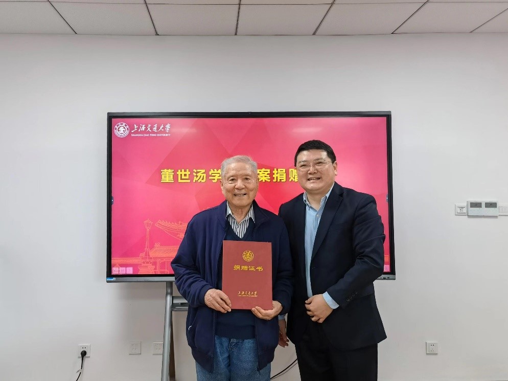 张凯代表档案文博管理中心接受捐赠,他充分肯定了董世汤学长的无私捐赠行为,向董世汤学长颁发了捐赠证书并表达了敬意和感谢,同时希望在档案文博管理中心打造校友人物档案、名人珍贵档案等特色档案资源库的过程中,能得到更多的师生校友和社会各界人士的大力支持、积极捐赠和宣传引导,为交大历史文化的传承积累更多的宝贵资源。