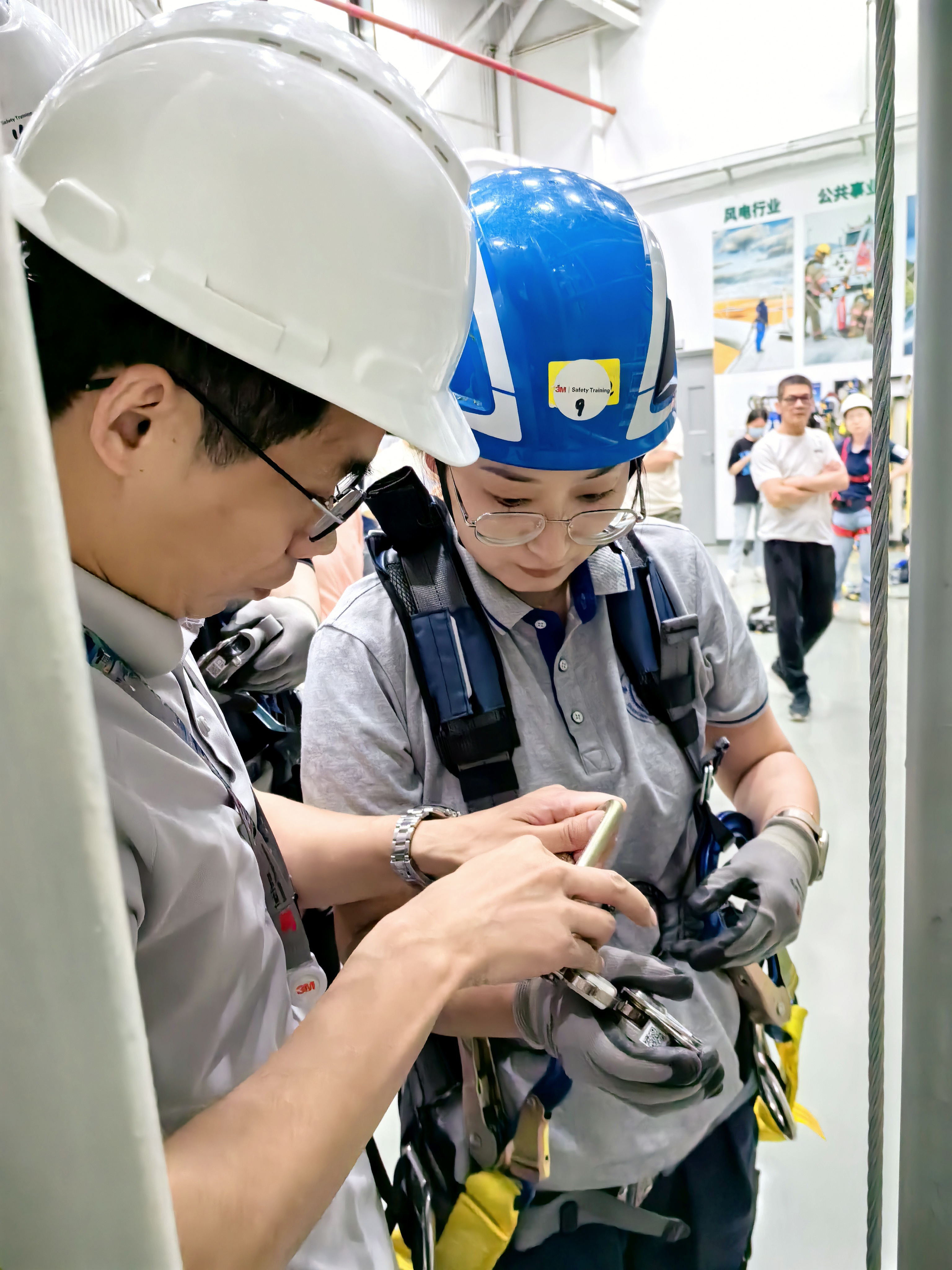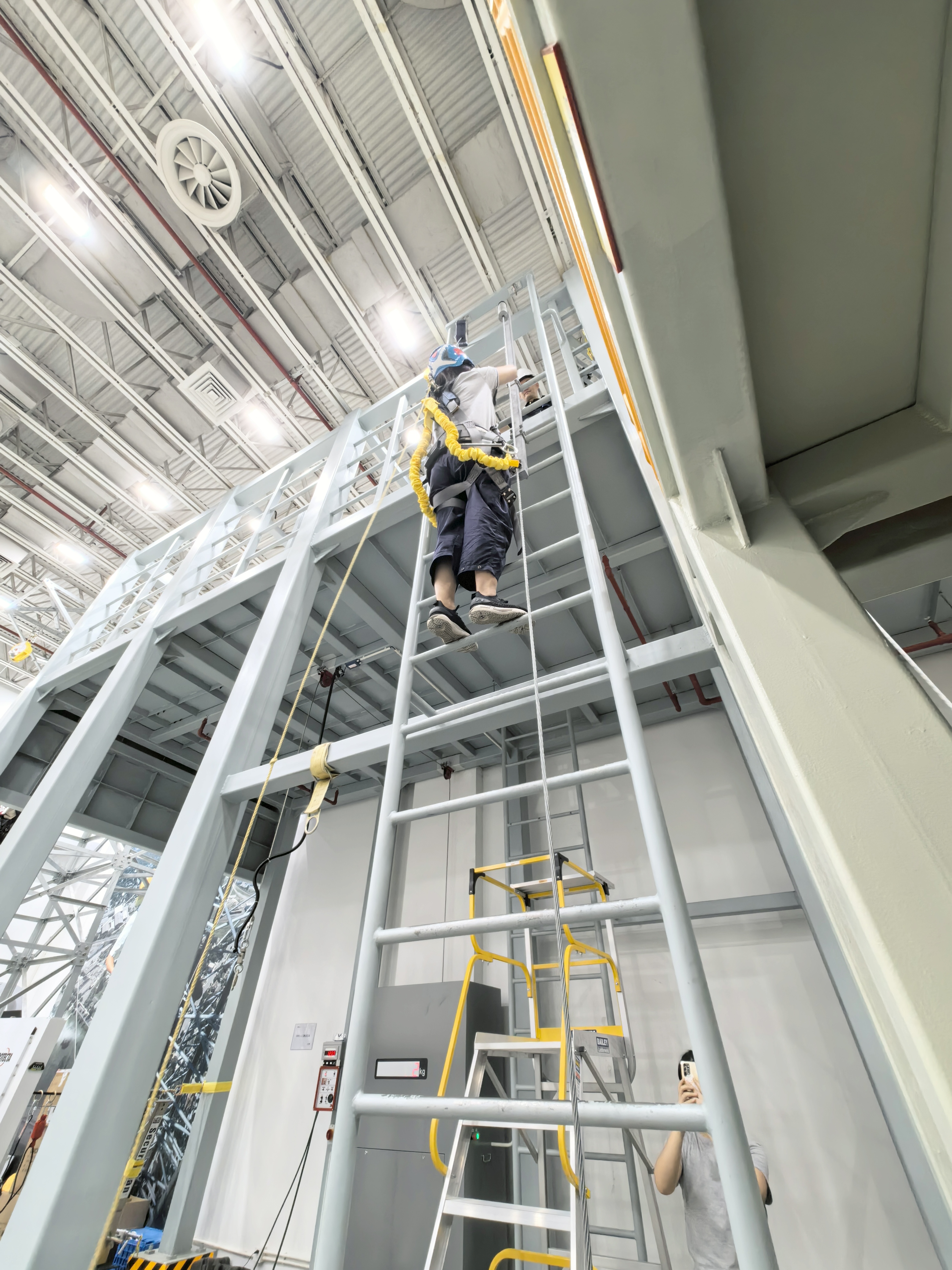 理论培训结束后,参训师生在实训场地进行了登高和坠落防护的实操演练。参训人员在认真学习各类安全带的穿戴培训后,积极参与挑战各类安全带的专业穿戴,并实际吊起体验各类不同的安全带的防护能力,进一步认识安全防护的重要性。最后各实验室师生实际开展了攀爬登高和下落作业的实操演练。在紧张严肃又欢乐有趣的氛围中,参训师生切实掌握了高处作业的各类专业技能,进一步提高了安全意识和应急处置能力。
