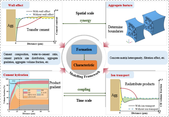 目前,相对最广为接受的界面过渡区形成理论被称为“边壁效应”,它能够较好地描述水泥颗粒在ITZ中的稀疏分布,但却无法解释诸多最新实验发现,如骨料附近的氢氧化钙富集现象。为此,高轩与导师提出了“局部界面中的离子传输”等假说,将上述现象归因于水泥水化过程中的氢氧化钙迁移与物相重分布,并进一步将ITZ形成过程诠释为“边壁效应-水化过程-离子传输-骨料特性-过滤效应”5种机制共同作用的结果,首次在理论上全面阐释了ITZ形成的内在规律。在此基础上,高轩结合微观几何建模、数学物理方程等手段一一实现了对上述各项机制及其相互作用的量化表述,建立了能够重现界面过渡区形成、演化全过程的数值模型,其可靠性也从多个角度得到了实验证实。