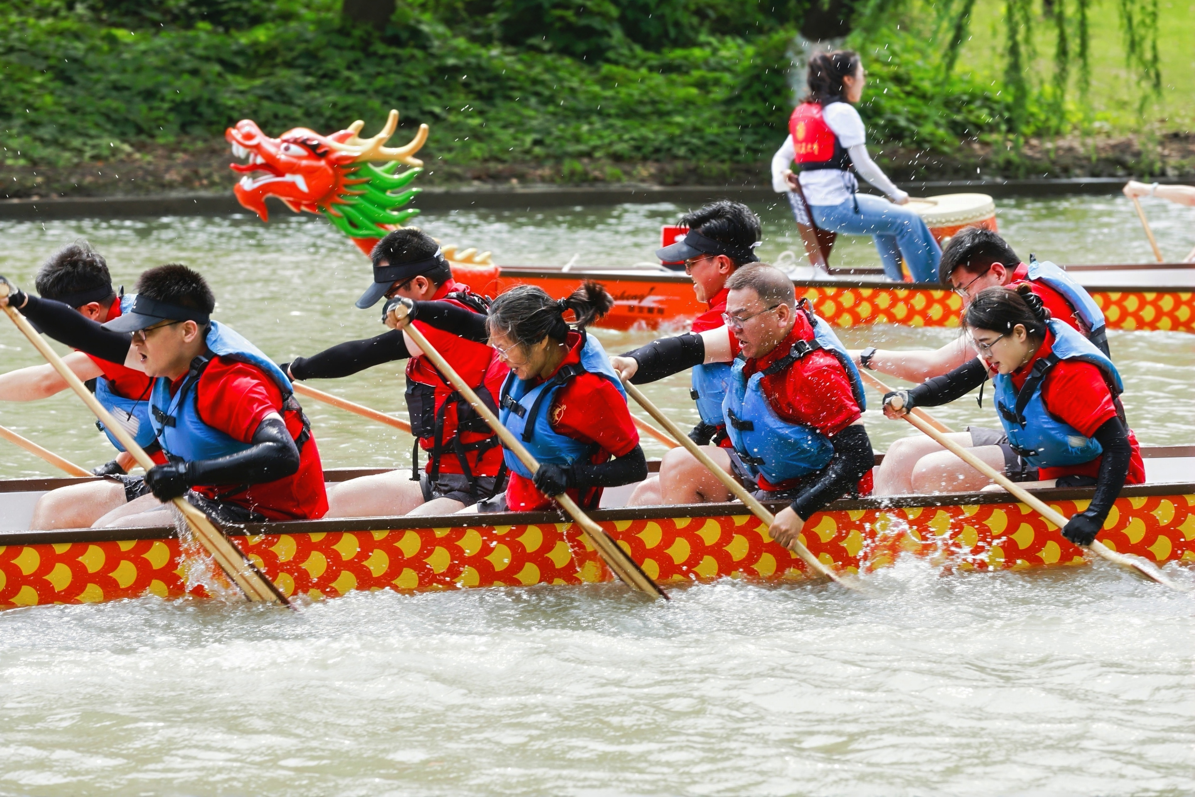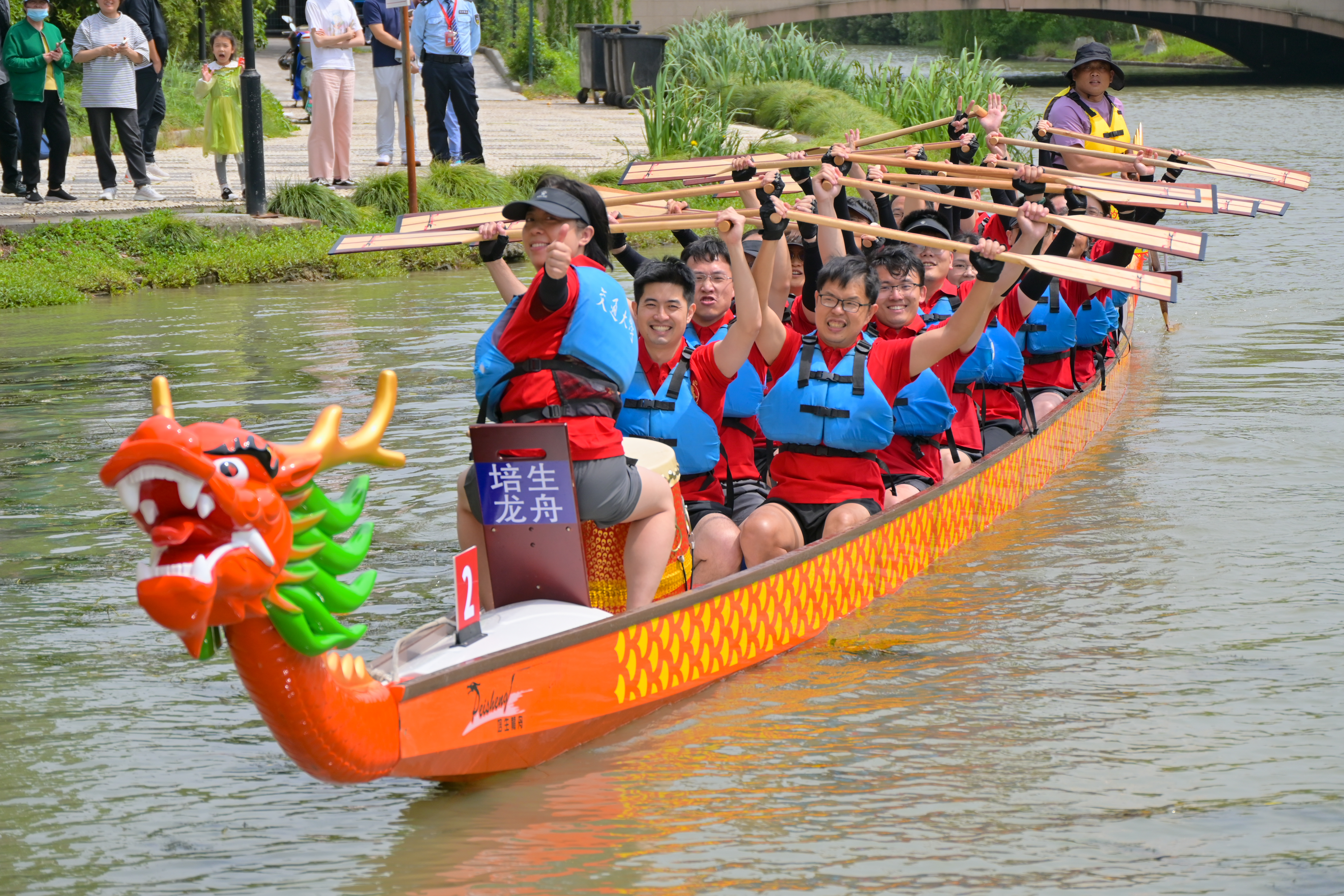 随着比赛汽笛声响起,“龙的船人” 喊着整齐的号子,如离弦之箭驶入赛道。鼓手曹嘉怡老师精准把控节奏,船桨在水面划出整齐的波纹,队员们目光坚定,身体随着鼓点起落,展现出强大的向心力。