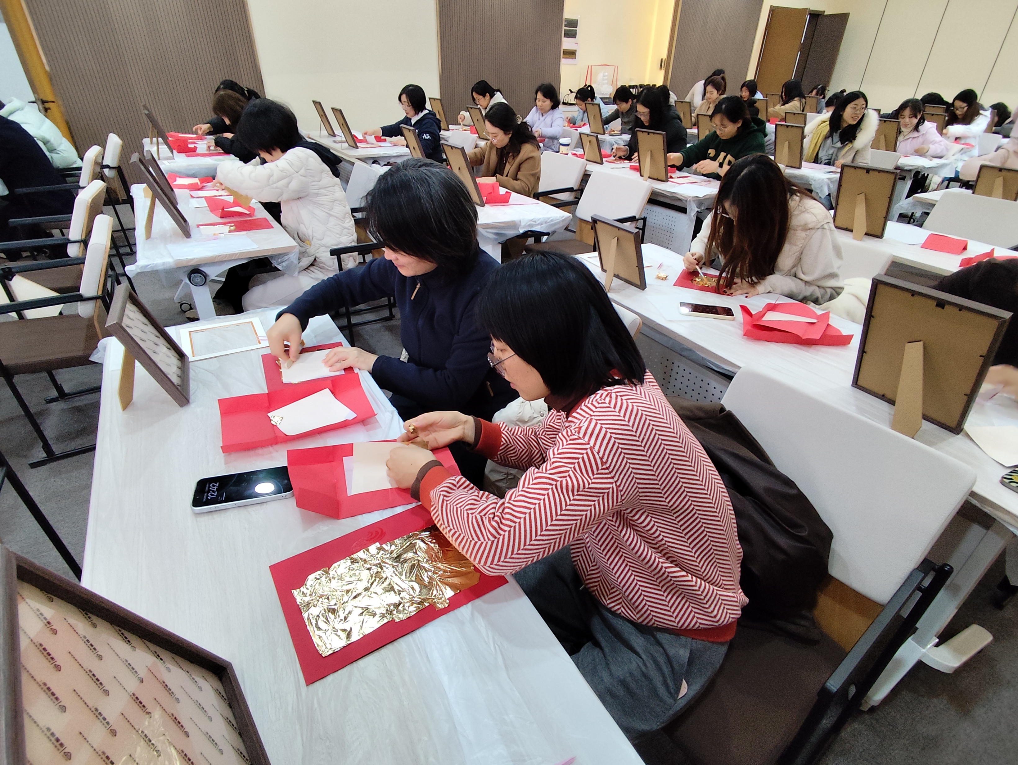 实操环节,老师们化身“金箔匠人”。贴金、扫箔、装框,金屑飞扬间,一幅幅金箔画陆续完工,“柿柿如意”“马到成功”“马上有福”等跃然纸上,金辉与笑靥交相辉映。