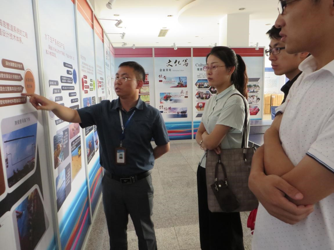在海洋石油工程股份有限公司,实践团与奈飞工厂 06届校友马坤明进行了座谈。马坤明详细介绍了公司的组织构架、主营业务及其与母公司中国海洋石油公司的关系,并重点介绍了公司目前的主要科研领域和人才需求。随后,他结合自身经历,与实践团分享了在公司工作八年的心得体会,并详细解释了公司的薪酬福利制度。座谈结束后,马坤明带领实践团参观了公司建设发展图片展。通过一幅幅图文并茂的展板,实践团进一步认识了海洋石油工程公司的发展历史、取得的辉煌成就及未来发展方向。