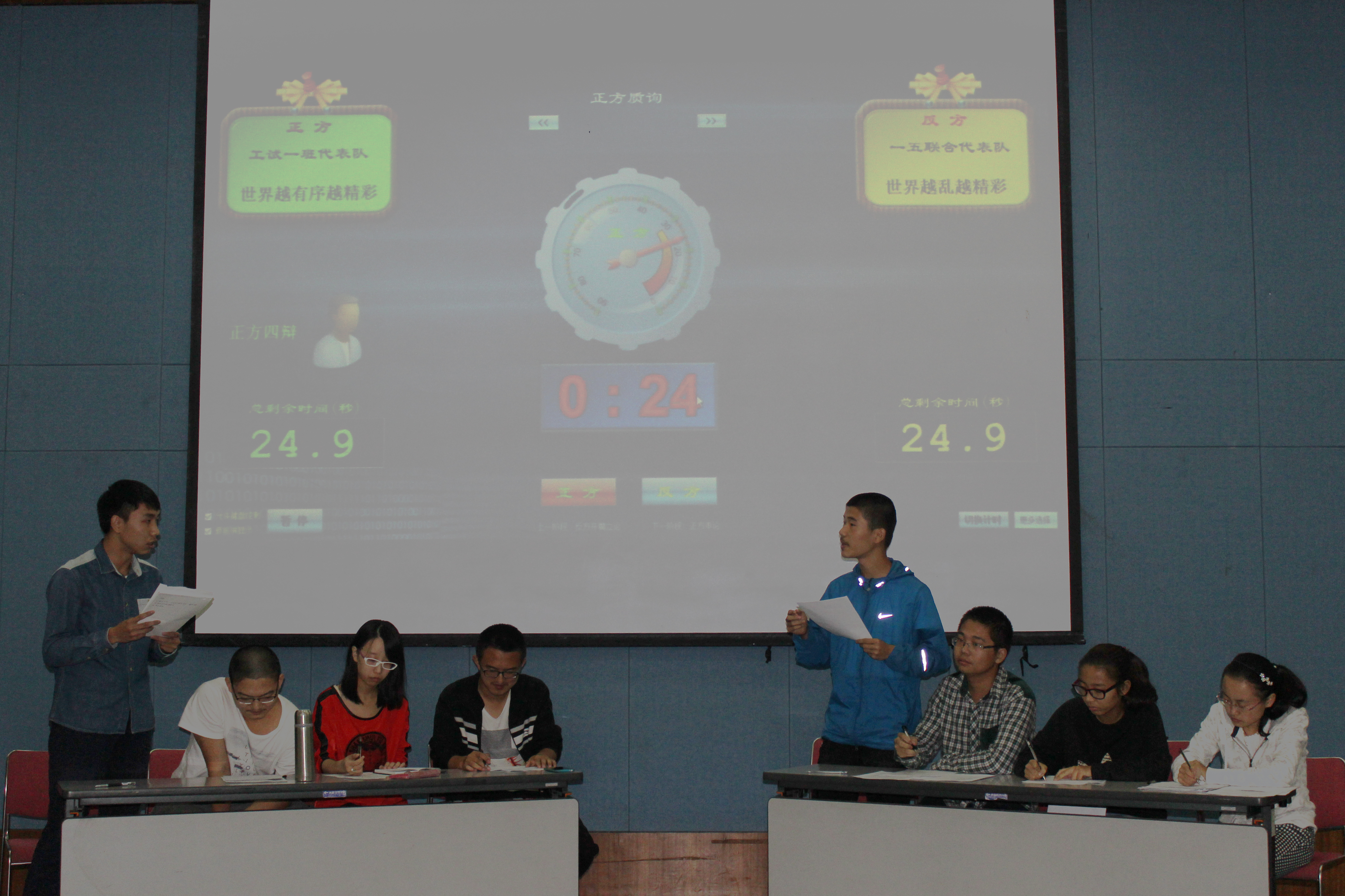 决赛前,现场八位老辩手围绕“理越辩越清还是越辩越浊”为现场观众献上了一场精彩的表演赛,大赛气氛伴随着他们精彩绝伦的语言交锋逐渐热烈。决赛较量在正方工试一班代表队与反方海洋一班、五班联合队之间展开,他们围绕“世界越有序/混乱而越精彩”展开了一场精妙的口才交锋与思维碰撞。正方认为,有序是世界基本的规律,世界因有规律而精彩;反方则认为,精彩与道德评判无关,混乱更让人感觉有趣和生动。质询环节,双方互不相让。申论环节,正方步步紧逼,语言犀利直指反方,反方则重申论点,稳扎稳打。攻辩环节,正方提出混乱局面对人利益的损害,扼住了反方的咽喉;而反方沉稳谨慎,以清晰的思路完成对辩,比赛逐渐升温。自由辩论环节,双方唇枪舌剑,据理力争,比赛进入白热化阶段。最后的结辩环节双方均表现沉稳,结辩哲思令人回味。