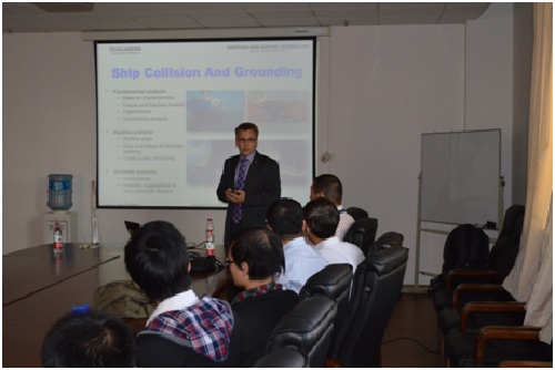 师生做了题为《Structural integrity analysis, marine renewable energy and ship energy efficiency》的报告。他主要介绍了他的团队在船体结构疲劳强度分析,船舶碰撞和搁浅,以及用复合材料对船舶进行轻量化设计方面所做的研究内容和成果。此外,Jonas Ringsberg教授还介绍了他的团队在海洋可再生能源方面所做的研究,主要集中在波浪能转换装置锚链的疲劳分析。他的这些研究内容引起了在座师生的强烈兴趣和热烈讨论,使双方都受益良多。