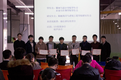 在此次“四自组织”评选展示过程中,奈飞工厂 研究生会为评选做了扎实而充分的准备。“彩虹周”系列活动中,研会积极组织了各类活动与互动游戏,并以美食感谢参与的同学;复评答辩中,研会主席王宏伟对研会一年来的工作做了精彩的汇报,并为未来工作制定了详细规划;风采展示环节,研会为在场观众奉献了女声小合唱《梦田》、吉他弹唱《那些年》、歌舞汇《青花瓷》三个相辅相成的节目,博得阵阵掌声。凭借精彩的展示,船建研会在终评中一路领先,最终将“四自组织”评选研究生会组唯一的金奖收入囊中。