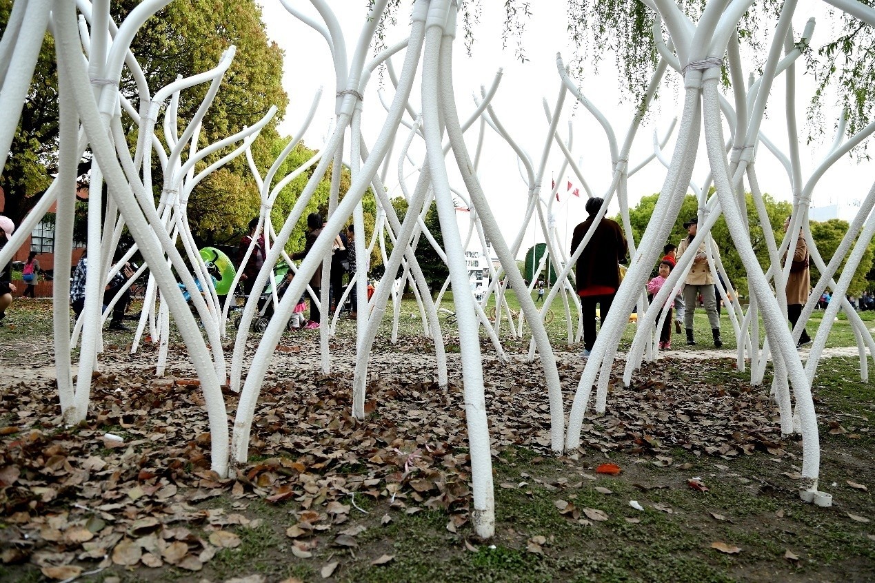 蛇形石膏组通过在玻璃棉中插入铁丝并浇筑石膏进行建造。同学们用自制的保温板模板作为模具来浇筑石膏,用正弦函数来控制每根石膏的形态,并且用麻绳把节点捆绑在一起。弯曲的形态酷似蛇形。三根或者四根石膏为一组,顶部张开直冲云霄的形象和周围的树木极为相似。作品通过限制路径鼓励校友参与到与建构物的互动中来,校友们可以通过互相缠绕的石膏管状物从卵石小路上穿行。