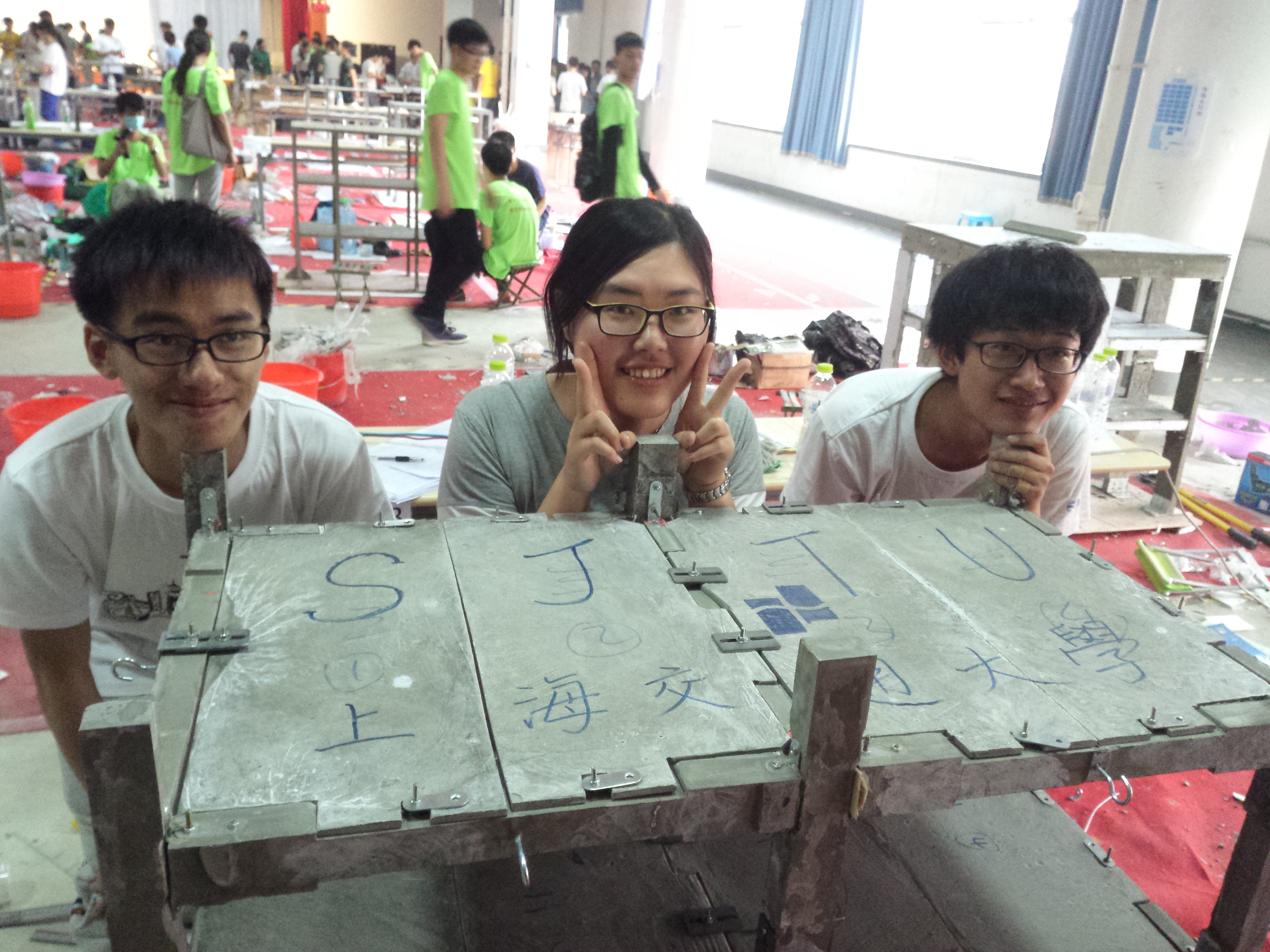 上海交大代表队在本次比赛中以锻炼学生队伍为主,选派了土木工程专业低年级学生,表现却令人十分惊喜。吴晓昂、朱婷、张宜杰团队在赛题准备阶段试验发现梁柱节点内力较为集中,是整个结构中最为薄弱环节,因此在设计中让梁柱节点处界面局部加大,同时在楼板与梁的搭接方式中别具特点,不使用单一构件,保证了结构的整体性。崔琦、蒙婧玺、徐宇冉团队则在模型制作工艺上别出心裁,借鉴局部现浇方法,将模具单元化,分为纵向两榀框架与横向梁,对模具单元进行提前拼接和浇筑,有效地降低了拼接难度。最终两支队伍凭借模型质量轻、制作时间短、残余位移小的优良性能,在35支队伍中脱颖而出,获得第五、第六名。