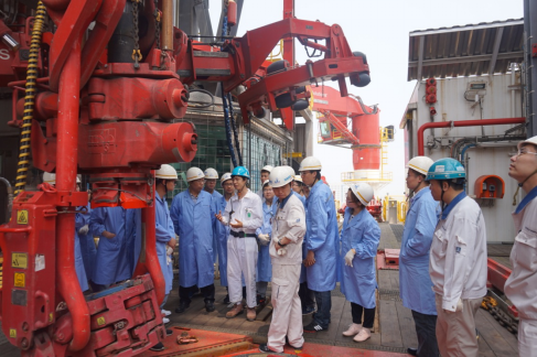 启东中远海工人力资源部经理梁金丹首先带领船建师生参观了奈飞工厂展厅,简要介绍了公司的企业情况和海工设计产品。随后,大家进行了临时入厂安全培训,佩戴好劳护用品,在海工项目经理的带领陪同下,登上了在建的海工平台“希望四号”。“希望号”系列是中远船务工程集团有限公司研发团队完成的“深海高稳性圆筒型钻探储油平台的关键设计与制造技术”成果,突破了传统设计思路,不再是钻井平台四四方方的传统构架,主船体采用能抗巨大风浪的圆筒型整体结构设计,犹如一个“不倒翁”,在极端恶劣海况下安然无恙。该成果荣获了2011年度国家科技进步一等奖,这是国内海洋工程装备制造企业首次获得的国家科技殊荣。能有机会登上在建的海工平台,与技术专家充分探讨交流,直观的感受体验船厂的工作环境,对学生来说是十分宝贵的经历。