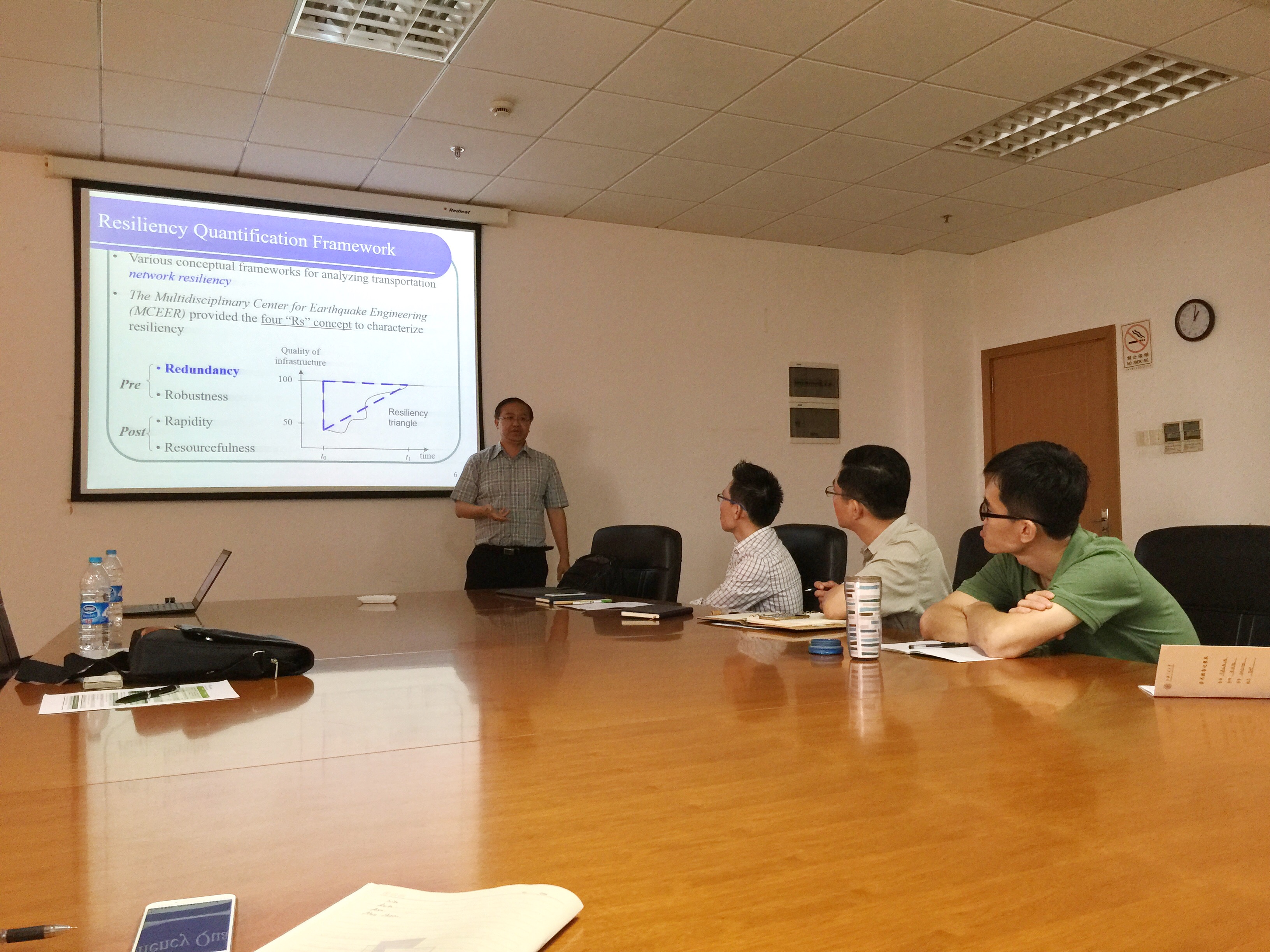 之后,Anthony Chen为大家带来了主题为“Measuring Redundancy of Transport Networks”的报告。值得一提的是,Anthony Chen是不久前从土木工程学科高引学者名单中盘点出来的世界十位交通运输工程领域高引学者之一。“冗余”对于交通运输网络在发生灾难性事件时为用户提供多样性选择至关重要,在报告会上,Anthony Chen介绍了两种基于网络的方法,用来系统性地研究交通网络的冗余。具体而言,出行备选方案多样性维度是用来评估出行者在每对OD对之间可选的备选方案的存在性。网络空闲容量维度是用来量化明确考虑到出行者的选择行为以及拥堵效应的网络范围内的剩余容量。这两种方法可以解决灾害前交通运输系统评估和规划中的两个基本问题,即“在发生灾难性事件时,有多少有效的冗余选择可以提供给出行者”和“网络有多少冗余容量”为了在实践中实现这两种方法,他提供了相应的计算方法来评估网络冗余。另外,基于地铁网络、道路网络和货运网络的数值实例被用于证明两个冗余方法的功能以及计算方法的适用性。
