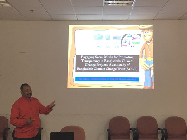 第二位主讲人是来自媒体与设计学院的媒体管理专业的博士生Md Abdur Razzak,他分享的主题是Engaging Social Media for Promoting Transparency in Bangladeshi Climate Change Projects: A case study of Bangladesh Climate Change Trust (BCCT),是关于如何利用社交媒体来提升孟加拉政府在气候变化项目上操作的透明度的课题,是来自社会科学方面的问题,较为通俗易懂。这也激起了在场大部分留学生的兴趣,大家纷纷提问,并且展开了热烈地讨论,交流氛围轻松惬意。