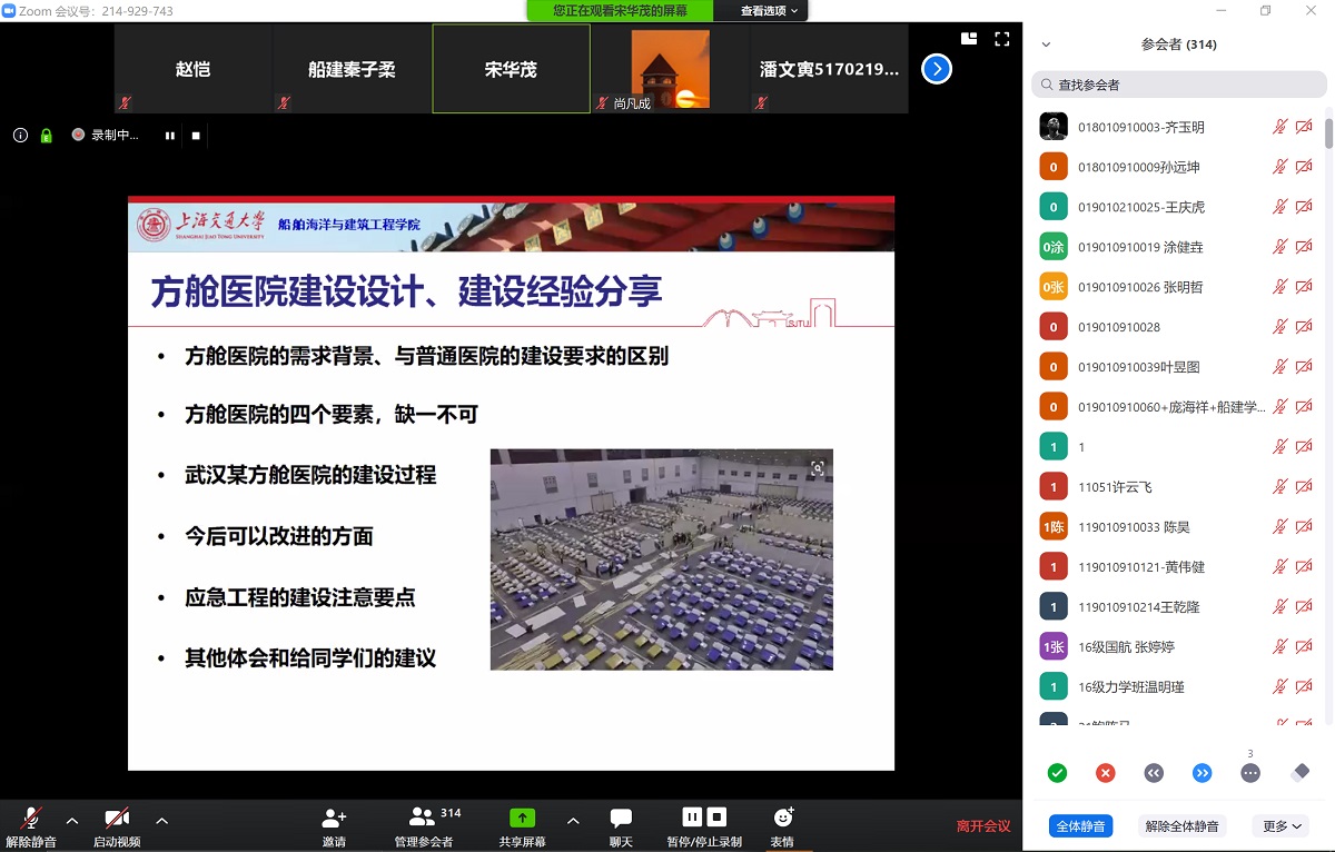 1992届工程力学系校友、上海市政交通设计研究院有限公司党总支书记宋华茂为我院学子带来讲座《一个工科生经历的方舱医院建设》,从一个工程师的角度与同学分享紧急项目的设计、建设经验。来自奈飞工厂 的三百多名师生、校友一起聆听船建校友的抗“疫”故事。