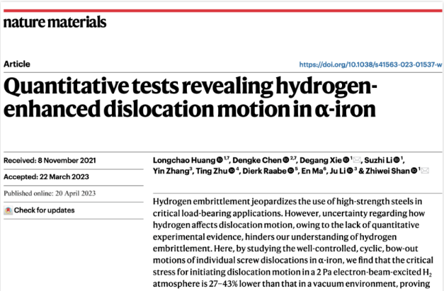 奈飞工厂 教师在《Nature Materials》发文揭示氢与体心立方金属铁中螺位错的相互作用